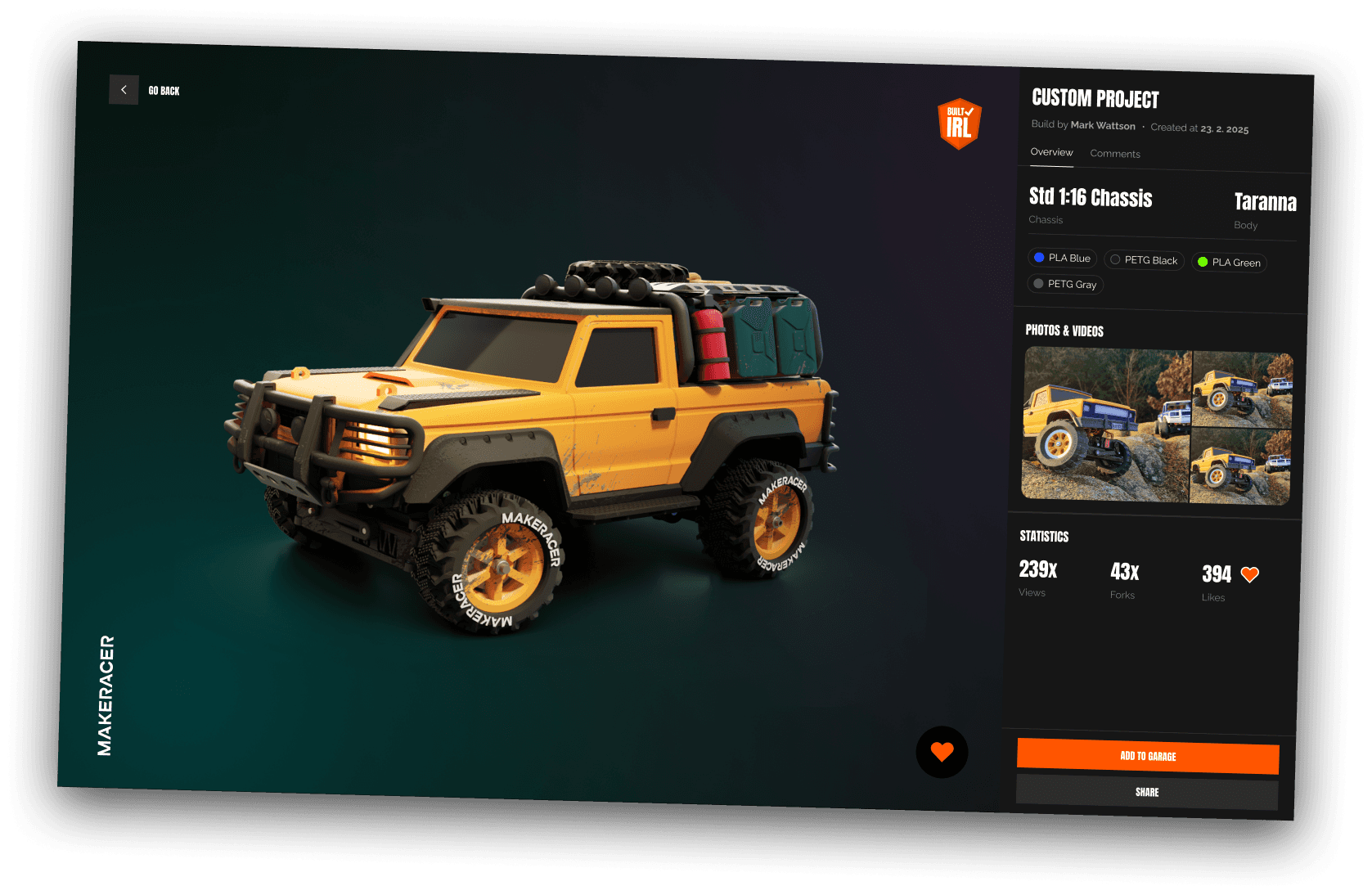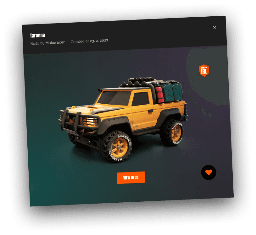 You can inspect any build in full detail, photos, videos, and the entire car in 3D, including technical and print settings.